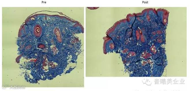 两次治疗后三个月胶原蛋白(蓝色)密度的全面增加