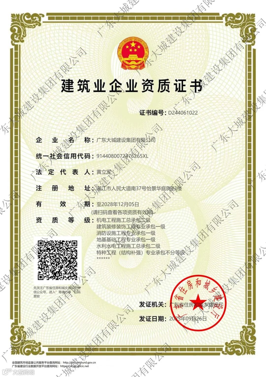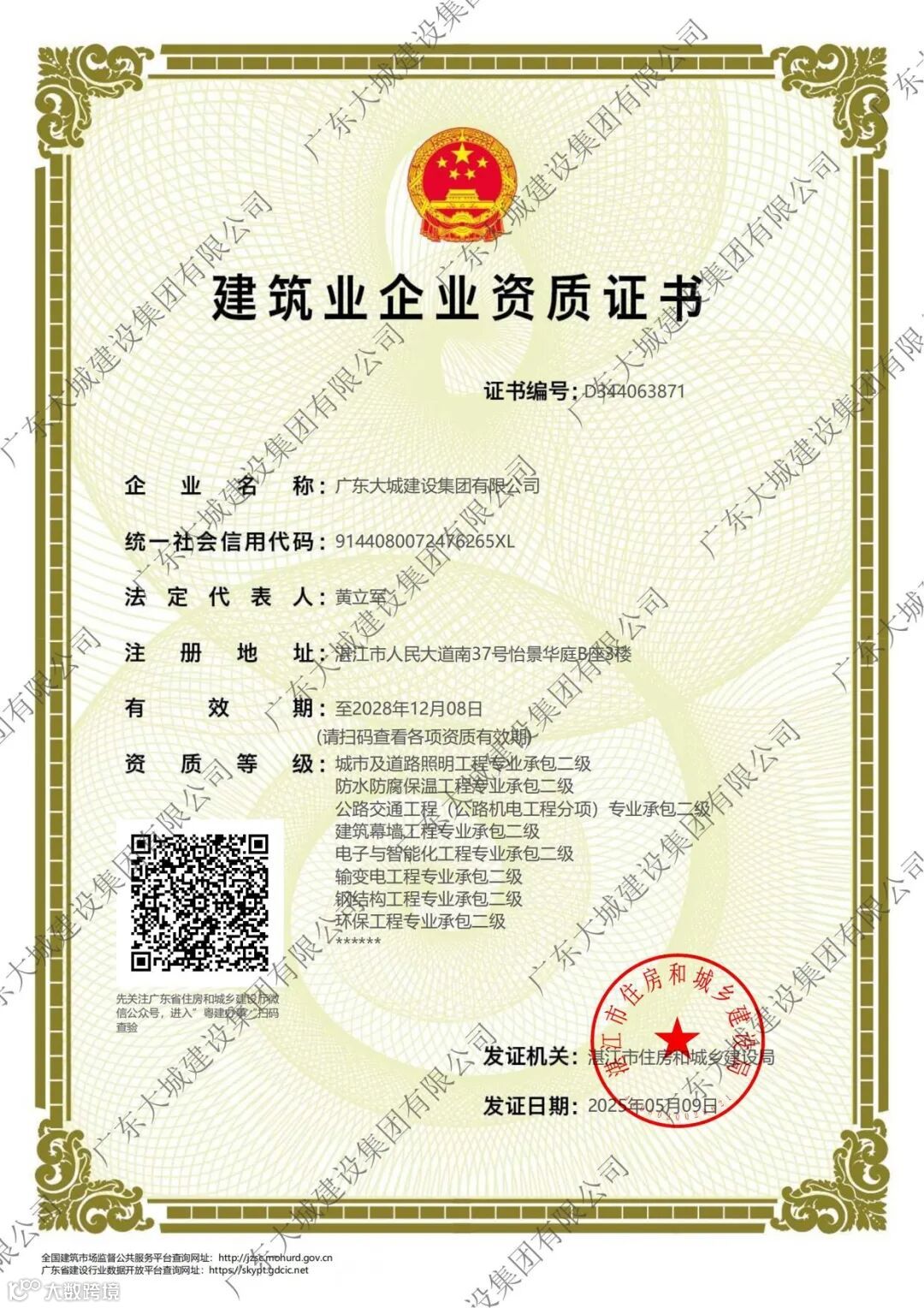 机电、建筑装修装饰、消防设施、地基基础、水利水电、特种工程(结构补强)资质证书