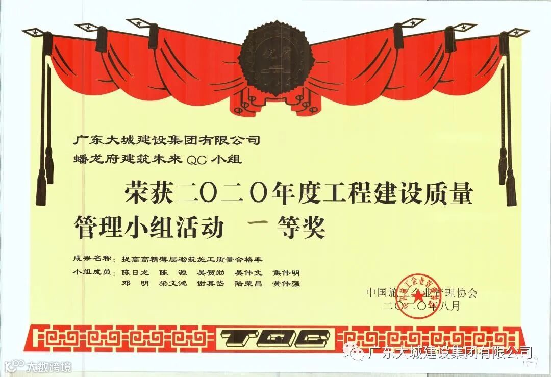 经过805组激烈紧张的分组发布竞赛,我司“蟠龙府建筑未来QC小组”申报的发布成果《提高高精度薄层砌筑施工质量合格率》,荣获全国“2020年度工程建设质量管理小组活动一等奖”。