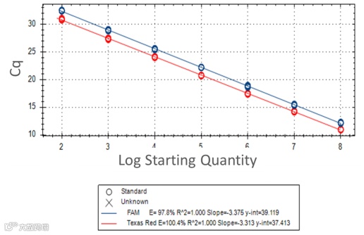 如果我们发现这些 Assay 之间没有抑制作用,那么就可以像优化单重 Assay 那样优化多重 Assay。我们将使用阳性对照模板运行标准曲线,最好是多个10倍稀释度,并检查以确保多重检测中的每种检测方法都能将扩增效率维持在90%到110%内,而且每组引物/探针的 r 平方值都在0.98或以上(最好尽可能接近1)。一旦检查并确认了这些要点,就意味着验证了多重 Assay,并可以使用多重检测来定量检测未知样本中的多个靶标。