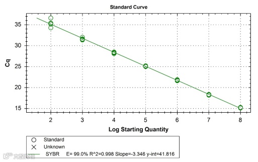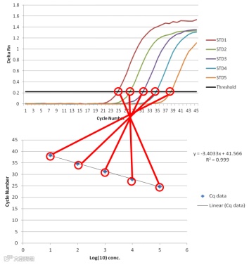 确定扩增效率的最佳方法是使用模板的系列梯度稀释生成标准曲线,并从 Cq(y 轴)与 log [数量] 的线性回归图中确定斜率。如果每个扩增周期都出现完美的加倍,那么荧光曲线的间距将由公式 2n=稀释因子决定,其中 n 是曲线之间的循环数。例如,cDNA 稀释10倍,2n=10。因此,n=3.32,每稀释10倍,Cq 值应增加约 3.32 个循环。关于扩增效率和斜率的解释和关系,请参考往期文章。
