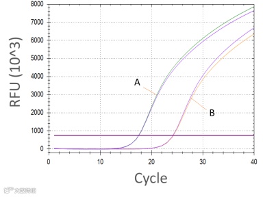 基因 A 的两条曲线(一条来自单孔,另一条来自混合孔)都是相同的。基因 B 也是如此。因此,两种 Assay 之间不存在负面抑制作用,则可以继续检测未知样本。但是,如果基因 A 或 B 的 Cq 值在单孔和复孔之间有显著差异,那么这可能表明这两种 Assay 不能很好地组合在一起,可能需要重新优化。