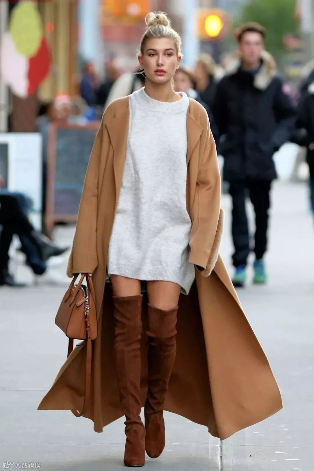 在冬天,很多女生都喜欢针织连衣裙+大衣的组合,像海狸一样搭配一双长筒靴,看着舒服温暖还显高。