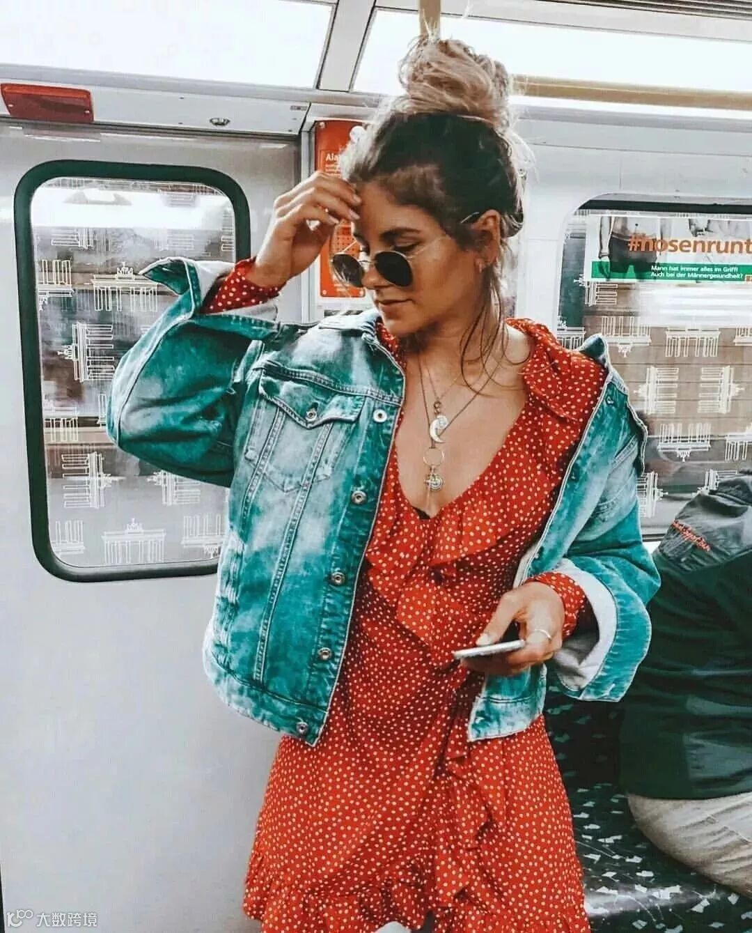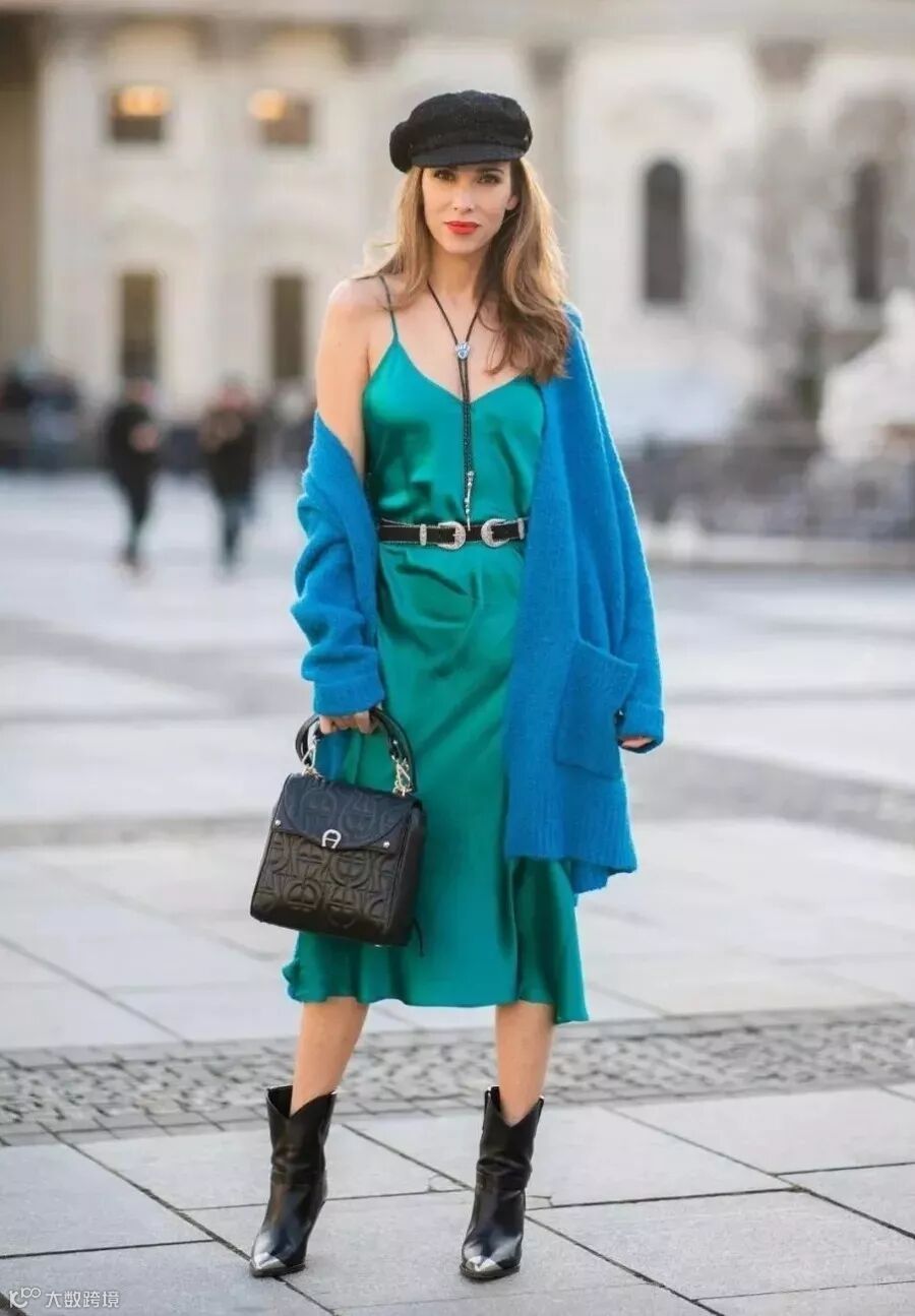 衣品超好的bella也pick过缎面连衣裙,外穿牛仔外套增加了一丝休闲感。