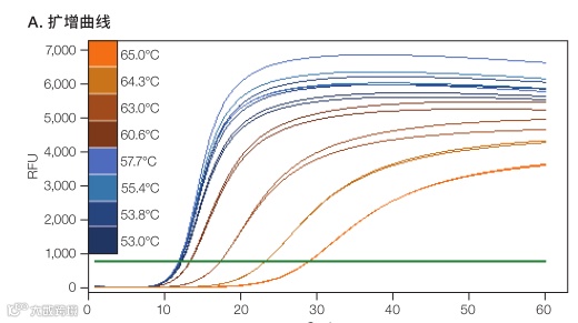 A, 使用温度梯度功能在某个退火温度范围内进行 qPCR 反应。扩增图显示在最低的四个退火温度( 53℃ 至 57.7℃)时,扩增效率最高。它们的 Cq 值最低;