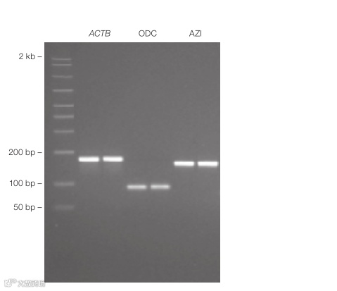 对扩增片段的凝胶电泳分析显示,存在一个符合预期大小的片段。ODC:鸟氨酸脱羧酶;AZI:抗酶抑制剂。