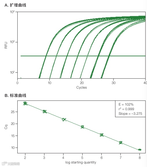 理想情况下,梯度稀释系列将产生技术重复之间重叠、梯度稀释之间间距均匀的扩增曲线(图 5A)。如果每个扩增周期都出现完美的加倍(2倍),则荧光曲线的间距将由公式 2n=稀释因子确定,这里 n 是指各曲线在荧光阀值时的循环数值的差( 即不同曲线之间 Cq 值的差值)。例如,将 DNA 稀释10倍,2n=10。因此,n=3.32,即表示不同曲线的 Cq 值之间相差为3.32个循环。均匀间距的扩增曲线(图 5A)将产生线性标准曲线(图 5B),其扩增效率应在 90-110%。