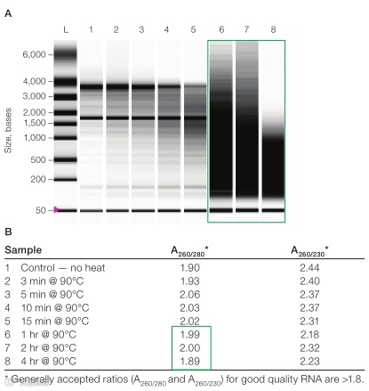 该图显示通过分光光度计和 Bio-Rad Experion 全自动电泳仪系统对 RNA 纯度和完整性进行析。 小鼠肝脏总 RNA 样品在 90℃ 、不同时长内进行降解,之后进行 RNA 纯度和完整性分析。绿色框显示,仅从吸光度值(≥1.8)来看,总 RNA 样品的质量是合格的,但通过 Experion 系统 RQI 完整性检测得到的低 RQI 值显示该样品已经降解。