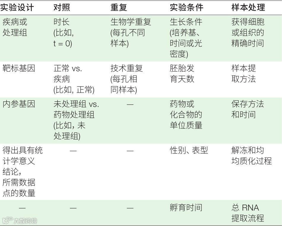 适当的实验设计是所有基因表达研究的关键。因为 mRNA 转录对外在因素敏感,因此必须在严格的对照及明确的设定条件下进行。花时间设计并确定实验过程、对照组、样品类型、重复类型和次数、实验条件和每组内的样品处理方法,这些十分必要,对于最大限度的减少变异性至关重要(表 1)。在进行基因表达实验之前,应仔细记录这些参数,以确保发表的数据具有良好的生物学可重复性。