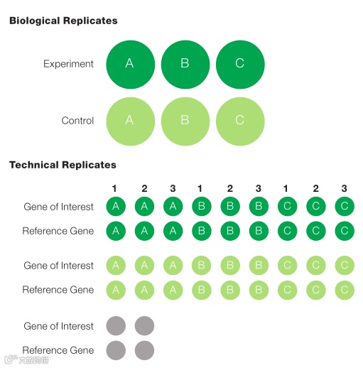 为减少生物学和技术差异的影响,一般认为每次实验至少要进行三个生物重复,每个生物学重复至少要进行两次技术重复(图 6)。如果实验是比较对照样本和处理样本之间的基因表达水平,则三个生物学重复样本应该来源于在独立实验中分别进行处理的样品。