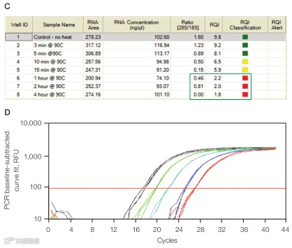 C, 使用 Experion 软件进行RNA完整性分析的摘要。28S/18S rRNA 比值和 RQI 提示热处理过的 RNA 样品完整性降低。通过颜色分类可轻松识别不适合进行 qPCR 的样本;