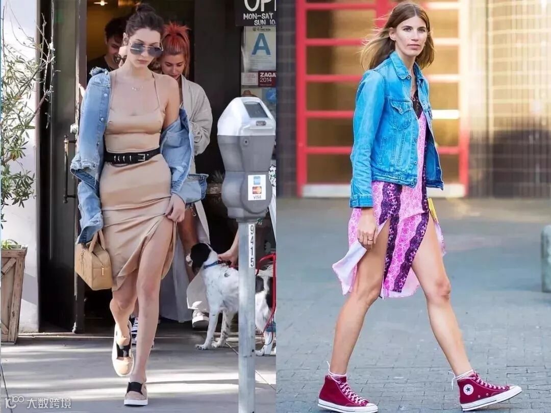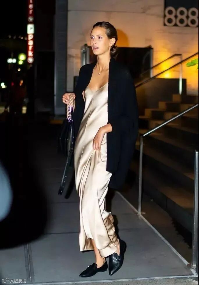 衣品超好的bella也pick过缎面连衣裙,外穿牛仔外套增加了一丝休闲感。