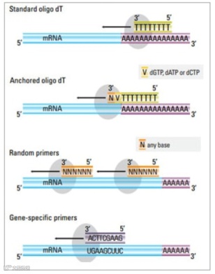 使用随机引物理论上可以进行代表 RNA pool 中所有成分的 cDNA 的合成。这种方法对 RNA 的完整性或转录本长度不那么敏感。反转录后的 cDNA 可作为后续的 PCR 或定量 PCR (qPCR) 的起始模板。