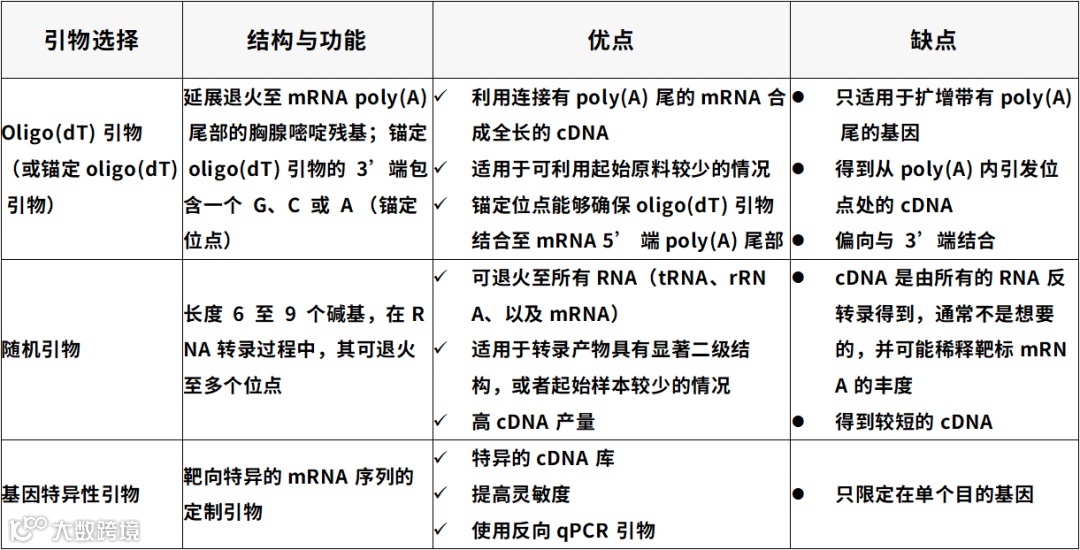 Oligo(dT)引物可从 RNA pool 中所有多腺苷酸化的 mRNA 分子中引发 cDNA 的合成。然而,由于这种引物从转录本的 3'端开始,靠近转录本5'端的扩增序列在 cDNA pool 中的代表性可能不足,因为并非所有 cDNA 都是全长的,此外由于 Poly(A+)RNA 仅占总 RNA 的1-4%,故此种引物合成的 cDNA 比随机六聚体作为引物和得到的 cDNA 在数量和复杂性方面均要小。