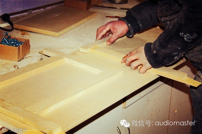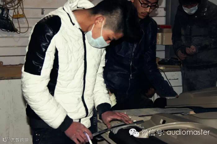 另一个师傅正在做后备箱功放的底座做模板.