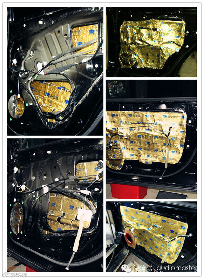 下面是四个车门的隔音...左前门里面先贴一层,然后再在外面贴一层,可以使车门成为箱体的效果,也可以加固其铁皮..贴完后敲打下车门,竟然发出沉闷的声音,不错...不错...,说是贴隔音,就贴一些隔音棉,止振板.就没给贴,.在这也给普及下,做汽车音响改装不建议张贴,因为其隔音棉会把音乐里的一些频率给吸收掉....
