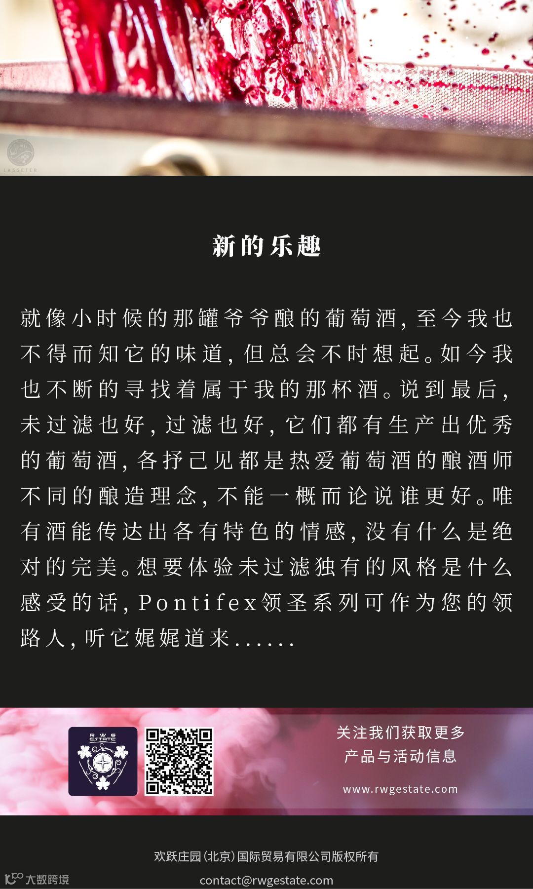 RWG Estate欢跃庄园,由两家位于墨尔本的公司联合建立。在澳大利亚多个知名葡萄酒产地,生产研发即富典型澳洲风味又别具创新的现代葡萄酒产品。欢跃庄园的美酒按照澳大利亚葡萄酒管理局的严格要求在当地生产并灌装,只为带给您更真切的澳洲体验。