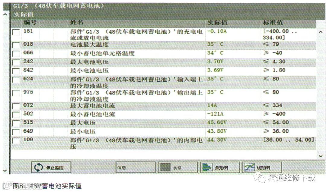 实际值端子40就是48V的供电线,可以看出上面是没有电压的,不正常,它是蓄电池的主控单元。那48V蓄电池的实际值怎样呢?48V蓄电池的实际值如图8所示。