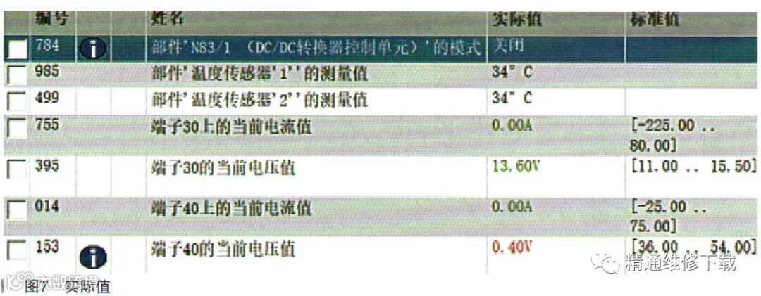 分析故障码,可知48V系统都报了故障码,那究竟是哪个部件出现了问题呢?故障码多不知道从何入手,那就先瞧瞧实际值,DC/DC的实际值如图7所示。