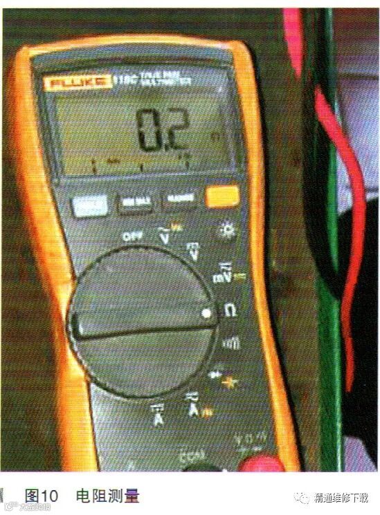 图9中的40就是启动机一发电机的48V电源输入端,41就是48V的搭铁端,当测量它们之间的电阻值时,发现它们之间是短路的,电阻值为0.2Ω,如图10所示。