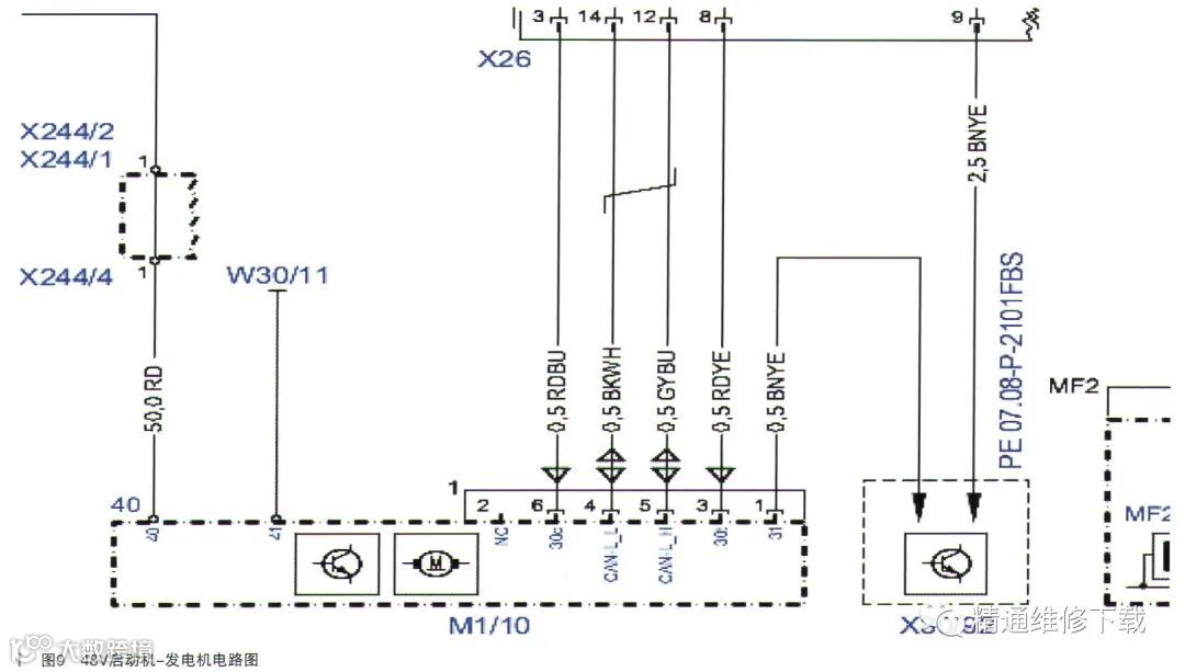 检查启动机一发电机的线路,没有对地短路的情况。48V启动机一发电机的电路图如图9所示。