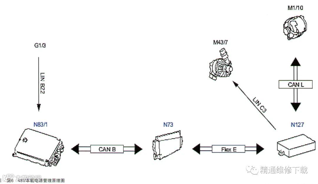 (G1/3)通过LIN线和DC/DC(N83/1 )通信的,DC/DC是主控单元,DC/DC通过CAN B和外界通信的,它们之间存在主从关系,而启动发电机是通过混合动力CANL和外界通信的。