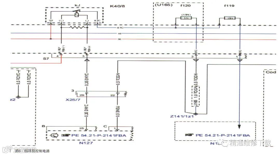 查阅电路图发现,循环泵是受KJ继电器控制的,而习继电器是受N127控制的,而这个KJ继电器是集成在K40/8中的,所以这个继电器不是很好测量。而这个继电器盒是很好拆装的,果断对调K40/8继电器盒,测试功能,一切正常。更换K40/8继电器盒后故障排除。