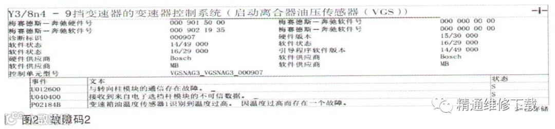 故障诊断:接车后,验证客户所述的故障现象,测试一切正常,仪表未报警,变速器换挡加速正常。连接诊断仪读取有如下相关故障码,如图1、图2所示。