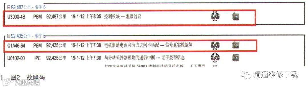 故障诊断:连接诊断仪SDD及稳压器读取相关故障码为“C1A46-64电机驱动电流和合力之间不匹配一信号真实性故障”和“U3000-4B控制模块一温度过高”,如图2所示。