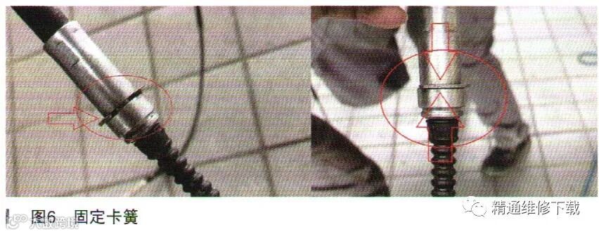 拆下左右制动器拉线,检查制动器拉线,固定卡簧安装良好。不是因为拉线没有安装卡簧导致。由于新制动器控制模块没有拉线固定卡簧,如果没有此卡簧会导致驻车制动器仪表报警驻车异响,原因是没有卡簧固定拉线会导致拉线过长,导致驻车制动机构卡死异响,如图6所示。