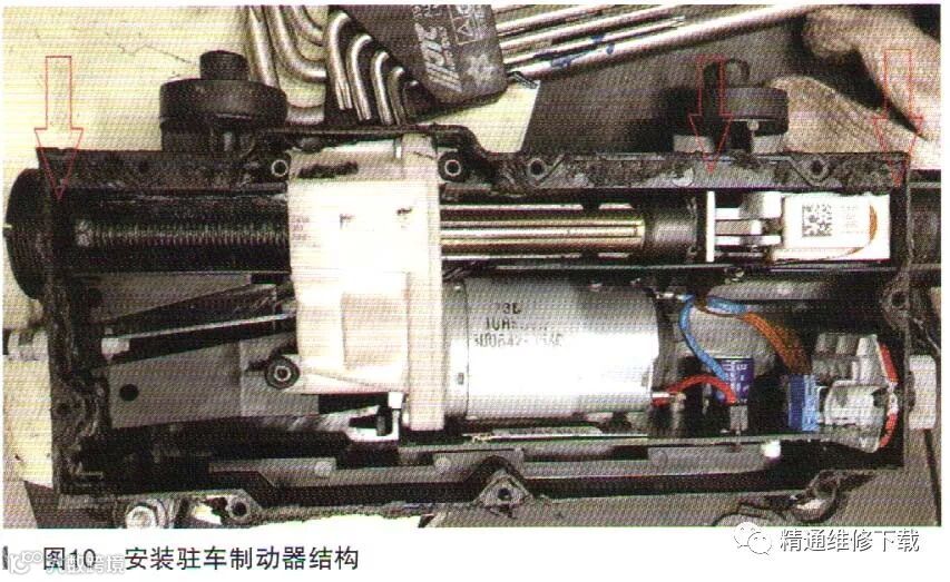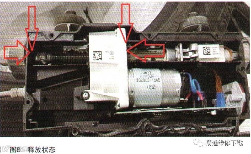 检查正常驻车控制模块机构花键轴和螺纹有一定间隙和距离,当释放驻车制动电机会驱动花键轴和螺纹移动,控制制动片接合和释放,图8是处于正常模式驻车制动释放状态。