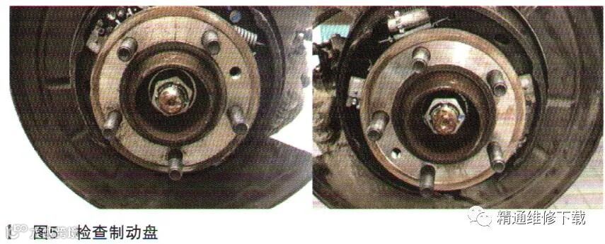 紧急释放驻车制动,参考Topix第206-04节拆下后轮左右制动盘检查驻车制动片安装良好(如图5所示),无卡滞现象,无松动损坏现象。检查制动片没有偏磨和异常磨损现象,检查后部左右制动片厚度约6-7mm,正常。