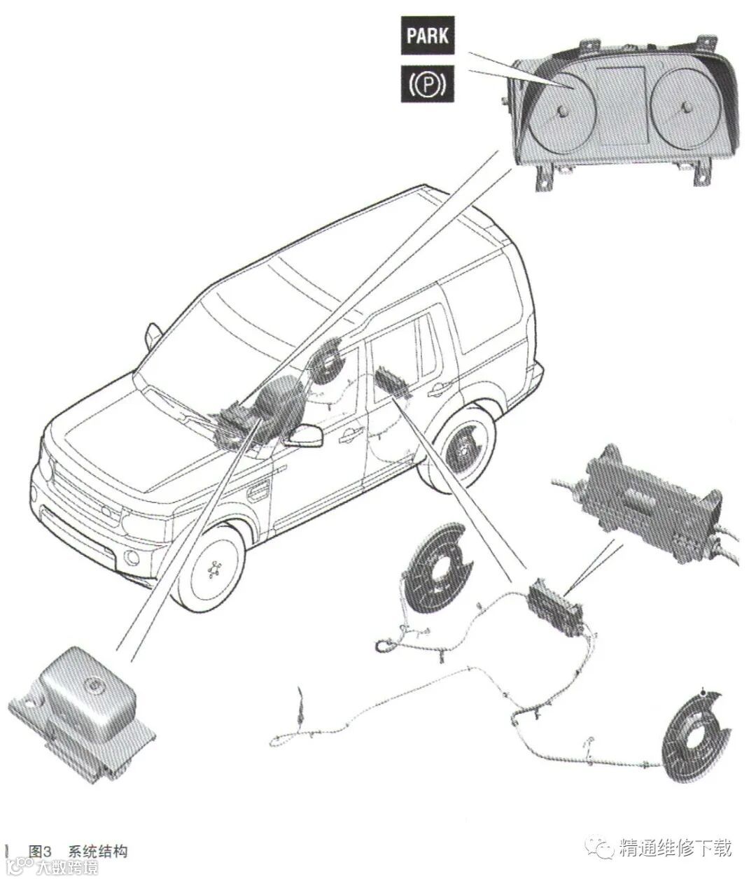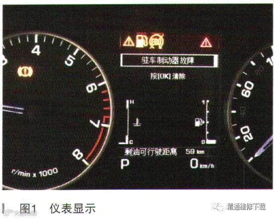 一辆行驶里程约9.3万km、配置3.0L发动机的2016年路虎发现四。客户反映:该车启动时车辆仪表驻车制动指示灯闪烁,踩下制动踏板按压释放驻车制动开关,车辆后部发出尖啸声,同时仪表制动故障灯点亮(如图1所示),确认故障存在。