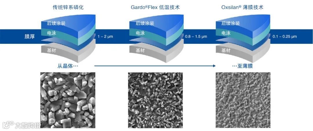 与传统磷化处理和Gardo®Flex低温技术相比,用Oxsilan®薄膜技术处理过的金属表面,形成一层“超薄”功能膜层。