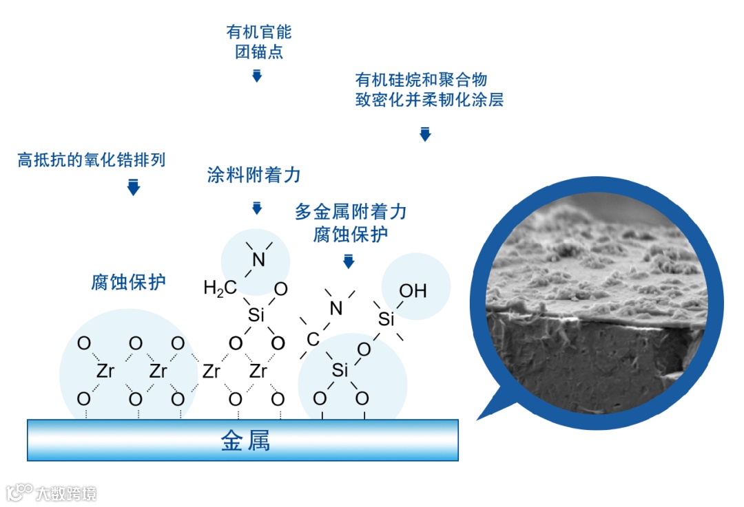 在前处理过程中,Oxsilan®薄膜技术与金属表面发生化学反应,形成的高抗性氧化锆排列增强了耐腐蚀性能,有机硅烷和聚合物的有机官能团锚点提升了附着力,助力金属综合防腐蚀性能的提高。