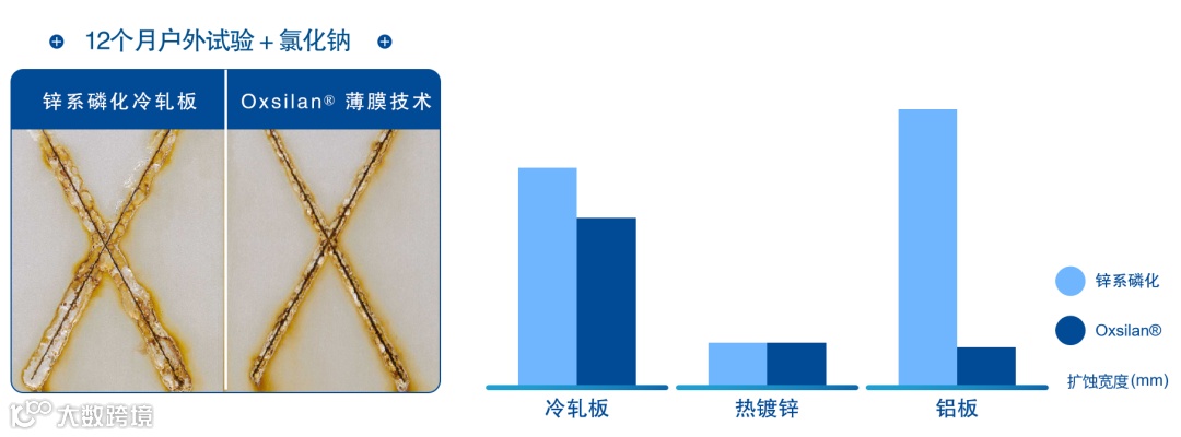 Oxsilan®薄膜技术是基于无机锆盐和有机氧化硅烷的复合型薄膜前处理技术,它会与金属板材发生化学转化反应而成膜,显著提高涂装后复合涂层的附着性能和综合防腐蚀能力。