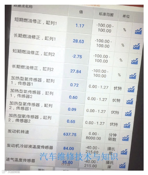 更换好炭罐电磁阀后,再次读取发动机数据流(下图),长短期燃油修正数据正常,故障解决。