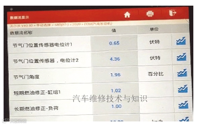 于是清洗节气门,并且在洗节气门的时候,电机朝上,防止清洗剂进到电机内部,造成不必要的麻烦。洗过之后,读取数据流,发现节气门开度下降到 1.96%,说明积炭确实会影响节气门开度(下图)。