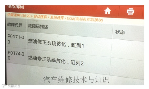使用电脑诊断仪读取故障码,内容为燃油修正系统贫化,缸列 1、缸列 2(下图)。