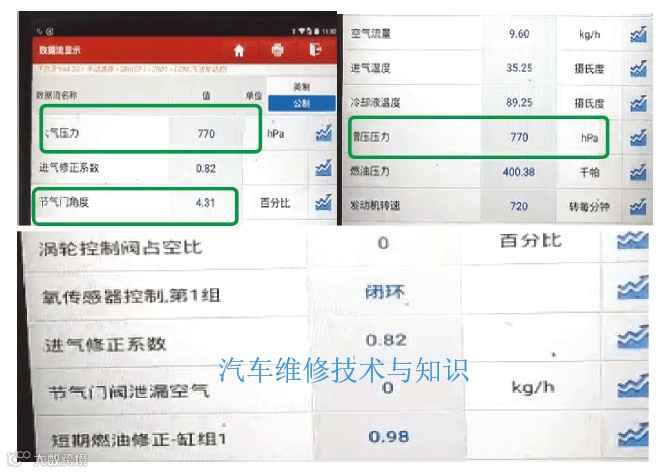 检查后确定进气系统没有漏气,从数据流分析,而且通过系统已可以看到漏气率,怠速进气量为 2.8g/s(10.08kg/h),在怠速工况,无论是慢慢加油,还是急加油,故障码都不会出现。从怠速的角度分析,发动机运转平稳,可以确定正时没问题,当时看到大气压力只有 77 千帕,就怀疑有问题,经过了解,当地的大气压就是这个值,如下图所示。