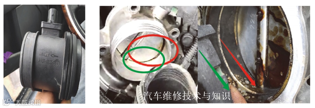 但发现这辆车的节气门开度偏大,达到 4.3%,检查一下空气流量计,是一个新的空气流量计,空气格也是新的,说明这车在别的地方修过。进一步检查节气门,发现节气门有油迹和积炭,当时就怀疑积炭影响到空气流量计的信号。比如节气门脏了,电脑会慢慢修正节气门开度,本来只需要打开两度,就可以经过 10克/秒的进气量,但是电脑计算到节气门要打开5度才能达到10克/秒的进气量,这时就会报空气流量计的故障码(下图)。