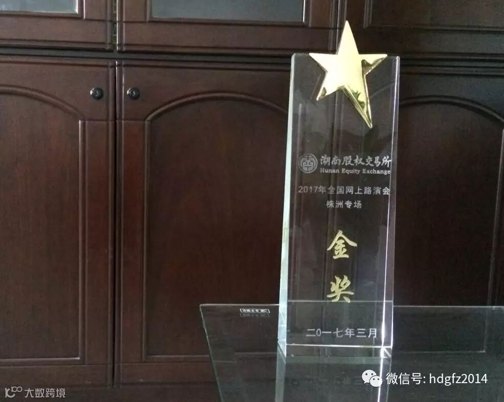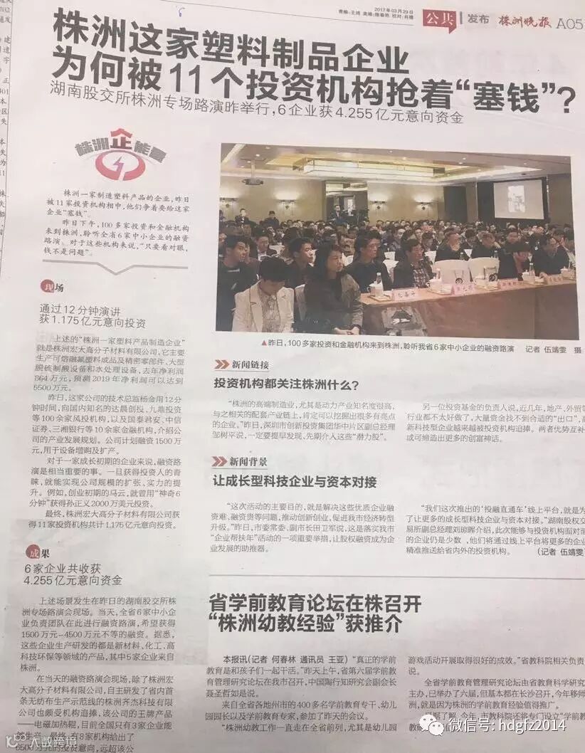 经过前期筛选,有6家企业进入当天的路演环节,宏大高分子作为当天入选企业,最终荣获湖南股权交易所“2017年全国网上路演会株洲专场金奖”,并获得11家投资机构共计1.175亿元意向投资。