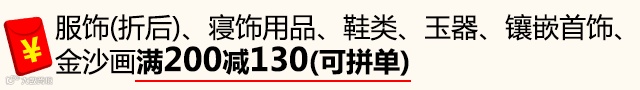 🔹服饰(折后)、寝饰用品、鞋类、玉器、镶嵌首饰、金沙画满 200减130(可拼单)