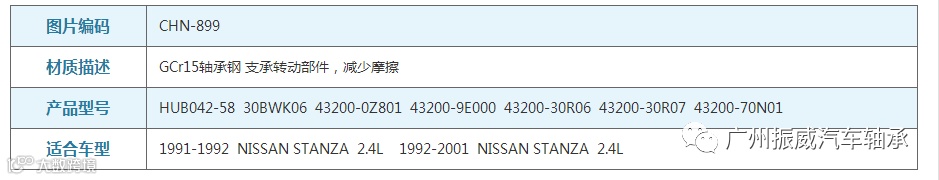 振威轴承提醒,汽车轮毂轴承的使用寿命是有一定年限的,因此对汽车轴承需要经常检查和替换。振威轴承生产的一款热门轴承轮毂单元(CHN-899)其中能匹配的OE号是43200-0Z801、43200-9E000、43200-30R06、43200-30R07、43200-70N01。