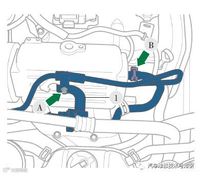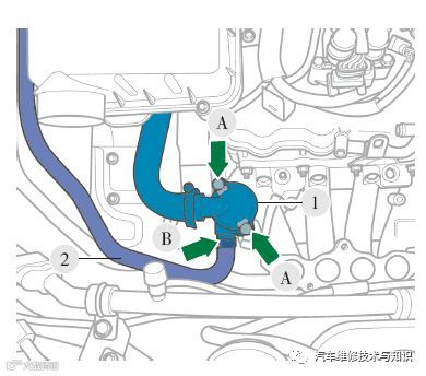 08 松开卡箍(箭头B),脱开暖风进水管2与进气歧管下部总成连接。旋出螺栓(箭头A),脱开节温器盖1与进气歧管下部总成连接。螺栓(箭头A)拧紧力矩:(20±5)N·m。▼