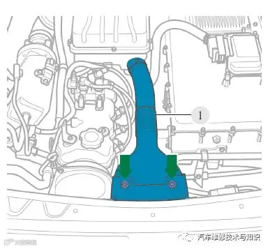 旋出进气管总成1的固定螺栓(箭头)。取出进气管总成1。螺栓拧紧力矩:(10±2)N·m。▼