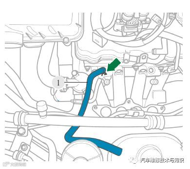 07 松开卡箍(箭头),脱开膨胀箱回水软管1与进气歧管下部总成连接。▼