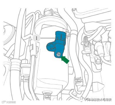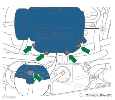 03 旋出进气温度压力传感器固定螺栓(箭头),取出进气温度压力传感器1。螺栓拧紧力矩:(10±2)N·m。▼