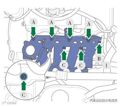 09 旋出进气歧管下部总成固定螺母(箭头A)、固定螺栓(箭头B、箭头C)。取出进气歧管下部总成1。螺母(箭头A、箭头B、箭头C)拧紧力矩:(20±2)N·m。▼