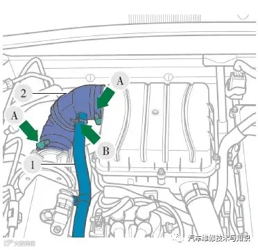02 松开卡箍(箭头B),脱开曲轴箱通风管1与空气管总成2连接▼